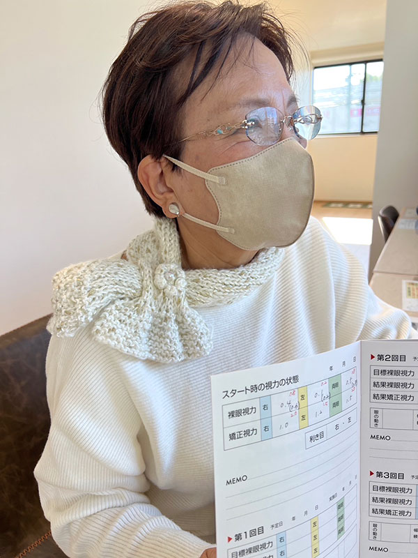 | 【担当スタッフより一言】 60代から視力回復を始めたM様。 緑内障と白内障を患っていらっしゃいますが、毎日フタワソニックをあてておられることで両眼のバランスも良くなっています!! ご来店頂くたびに喜びを感じて頂けてスタッフも胸が熱くなります。 |